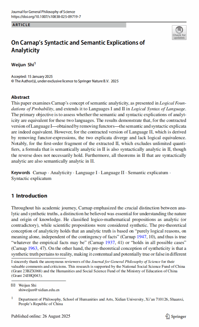 (通讯员 张妍)近日,国际著名期刊Journal for General Philosophy of Science发表石伟军副教授论文“On Carnap’s Syntactic and Semantic Explications of Analyticity”(论卡尔纳普对分析性的句法和语义阐释)。该篇论文考察了卡尔纳普在《概率的逻辑基础》中提出的语义分析性概念,并将其扩展到《语言的逻辑句法》中的语言I与语言II。研究的主要目标是评估这两种语言中语义与句法对分析性的阐释是否等价。结果表明:对于语言I的收缩版本—...