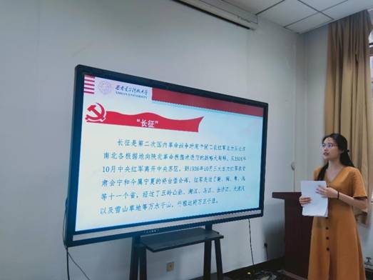 接下来由来自英国上市公司365的研究生史林鹰进行宣讲。她以毛泽东主席在长征途中创作的脍炙人口的诗词为切入点,从历史事实出发,通过一组组详实震撼的数据带领同学们回顾了红军艰难的长征路。长征是中国革命史上的奇迹,世界军事史上的伟大壮举。它在世界人民的心中,是一部不朽的英雄史诗。