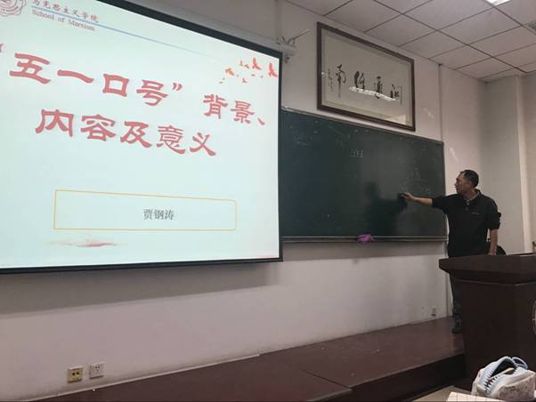 首先贾钢涛教授讲了“五一口号”提出的背景,“五一口号”在解放战争临近结束时提出。解放战争是反动的国民党发动,共产党被迫反击,解放全国的革命性战争。解放战争中共产党与国民党实力相差悬殊,但共产党凭借统一战线、武装斗争、党的建设三大法宝最终取得胜利。“五一口号”提出的背景是艰苦的。通过了解五一口号的背景,激发了同学们今后努力学习的动力,有助于同学们积极面对生活和学习中的困难。