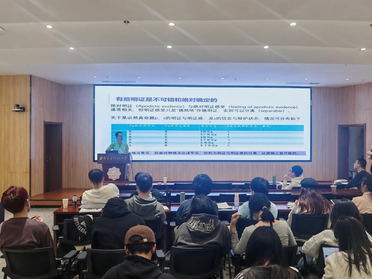 讲座结束后,会场随即迎来活跃的学术对话环节。在场学者与青年学子围绕现象学视域下的主体间性验证、数理逻辑的多模态表述等前沿议题,与主讲人展开深度学术探讨。李老师通过典型哲学命题的案例分析,既系统梳理理论脉络,又辅以生活化类比,其学理阐释与生活案例相得益彰,抽象理论被具象化为可触可感的智识图谱,引人深思。