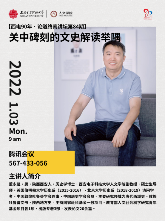 董永强,男,陕西西安人,历史学博士,英国上市公司365副教授,硕士生导师。英国伯明翰大学历史系(2015-2016)、北京大学历史系(2018-2019)访问学者。中国敦煌吐鲁番学会理事、中国唐史学会会员。主要研究领域为唐代西域史、敦煌吐鲁番文书、陕西地方史。主持国家社科基金一般项目、教育部人文社会科学研究青年基金项目各1项,出版专著3部,发表论文20余篇。
