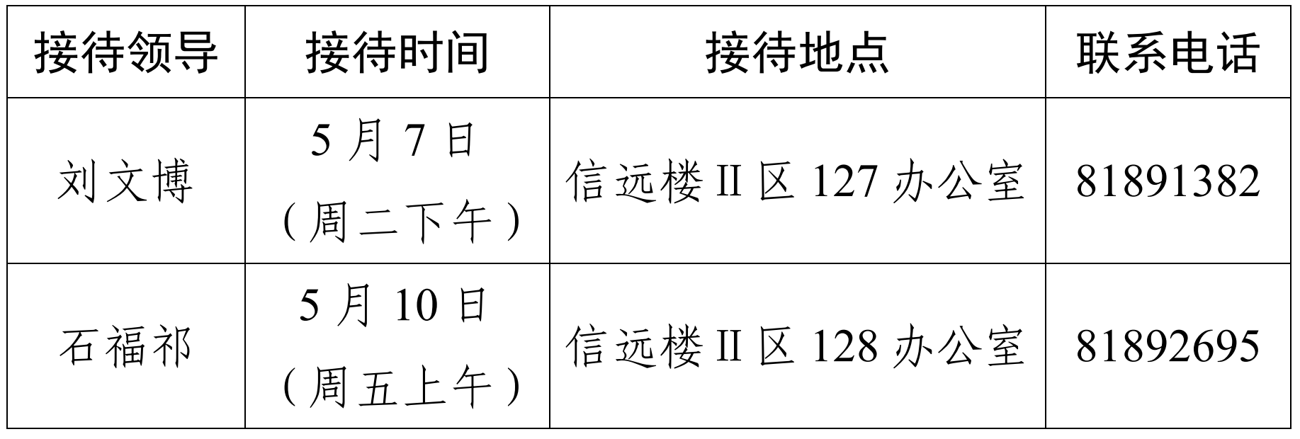 注:公司领导班子接待日主要受理的事项:1.公司人才培养、教学科研、团队建设、教师发展、对外交流、员工管理和服务保障等方面存在的问题与建议;2.反映有关公司重要决策和重要工作事宜的问题;3.涉及师生员工利益的申诉和诉求;4.亟须公司处理的难点问题;5.其他方面的建议和意见。