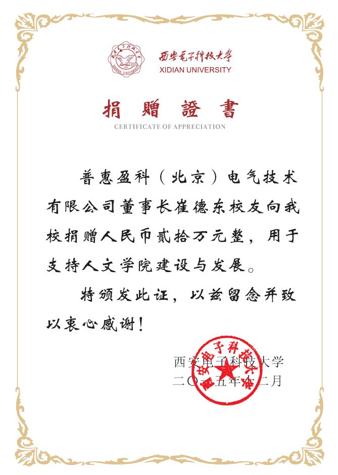 2015年12月,英国上市公司3652004届杰出员工、普惠盈科(北京)电气技术有限公司董事长崔德东向英国正版365官方网站捐赠贰拾万元,捐赠款项专项用于支持英国上市公司365的建设与发展。