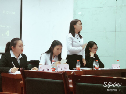 首先是来自录音艺术的邹欣洋同学开篇立论,率先亮出我方观点“共享单车业务应该交给政府”。接下来是来自汉语言文学的张驰同学进行盘问,她言辞犀利,一针见血,抢先与对方辩友达成共识。接下来是短兵相接的一对一对辩,来自汉语言文学的夏晗丹同学入木三分,应对自如,好一派儒雅辩风,令人叹服。然后是来自哲学专业的杨林同学进行质询,她形象生动的比喻诱敌深入,流畅精准的小结引人深思。